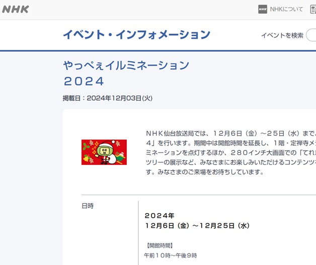 NHK 仙台人気キャラクター やっぺぇ のイルミネーションイベントが開催中